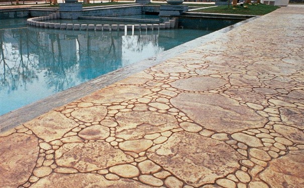 二、顏色與色彩:當采用露骨料裝飾混凝土時,其色彩隨著表面剝離的深淺和水泥、砂或石渣壓模地坪品種而異。表面剝離的程度較淺,表面比較平整時,水泥和細骨料的顏色將起主要作用;隨著剝離程度加深,粗骨料顏色的影響加大。在露骨裝飾混凝土的表面上,由于表面光影及多種材料顏色、質感的綜合作用,使其色彩顯得比較活潑。改變清水裝飾混凝土顏色的措施有多種,主要措施是在混凝土制品表面摻和顏料做一層色彩裝飾層,或者在混凝土表面噴涂一層色調適宜、經久耐用的涂料。改變露骨料裝飾混凝土色彩的有效措施,是采用色澤明亮的水泥或骨料,這種方法不僅可獲得較好的色彩,而且骨料色澤穩定、耐污染,具有很好的耐久性。目前,在建筑裝飾工程中最常采用白色水泥、彩色水泥或彩色骨科等。