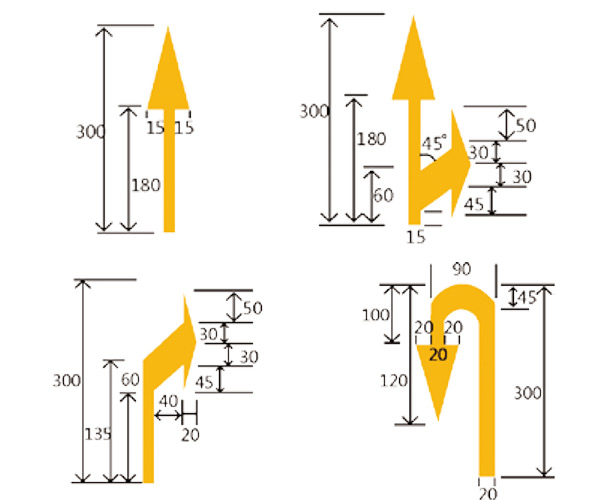 B﹑箭頭—引導(dǎo)車輛行駛方向,在車場內(nèi)適當(dāng)?shù)奈恢脴?biāo)志導(dǎo)向箭頭,按國家標(biāo)準(zhǔn)長為300mm.顏色為白色。