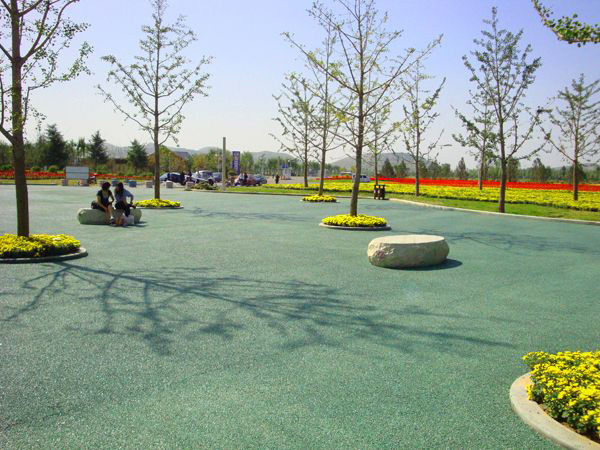 彩色透水地坪是采用專用骨料、透水混凝土增強劑、水泥和水拌制而成的一種多孔輕質混凝土,它不含細骨料, 由粗骨料表面包覆一薄層水泥漿相互粘結而形成孔穴均勻分布的蜂窩狀結構, 故具有透氣、透水和重量輕的特點,也可稱無砂透水混凝土,待凝固后表面用專用噴涂機噴涂丙烯酸樹脂罩面劑,增加表面色彩、光澤度、亮度、耐磨度。具有比傳統透水地坪更高的強度和耐久度,能滿足結構物力學性能,使用功能以及使用年限的要求,具有與自然環境的協調性,減輕對地球的生態環境的負荷,實現非再生資源可循環性使用,具有良好的使用功能,能為人類構筑溫和,舒適,便捷的生活環境。